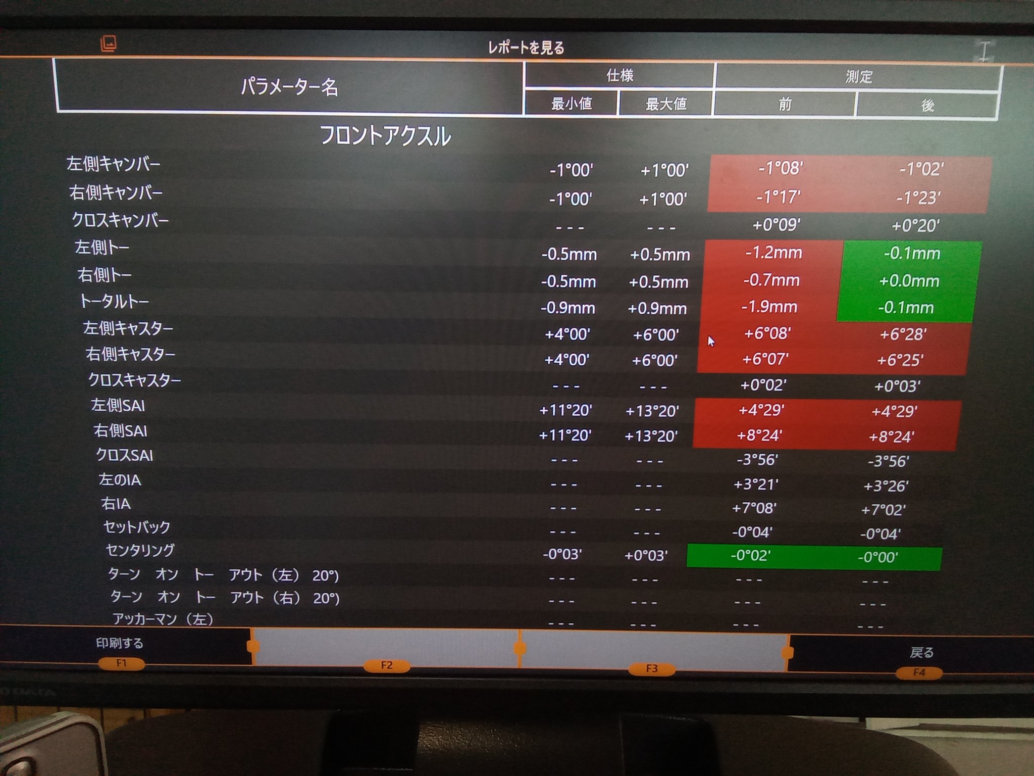 フロント左のトーが1.2mmトーアウト、フロント右のトーが0.7mmトーアウト