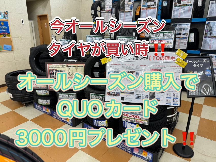 【タイヤが安い!】限定キャンペーン開催!!オールシーズンタイヤを対象期間中にご購入のお客様限定で3000円分のクオカードをプレゼント!足利・太田・桐生・邑楽エリアにお住いの方、その他の地域にお住いの方も是非!