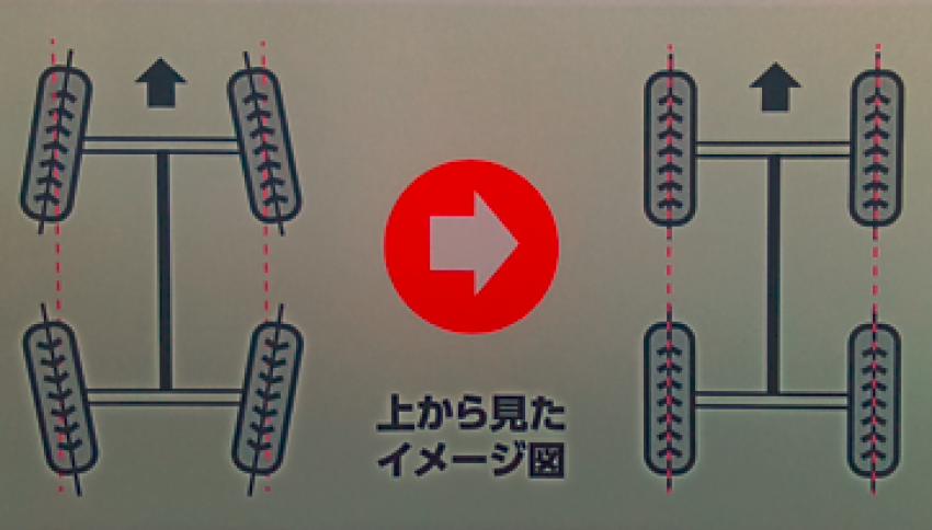 上の画像左の図がアライメントがズレた状態の車両の図です。