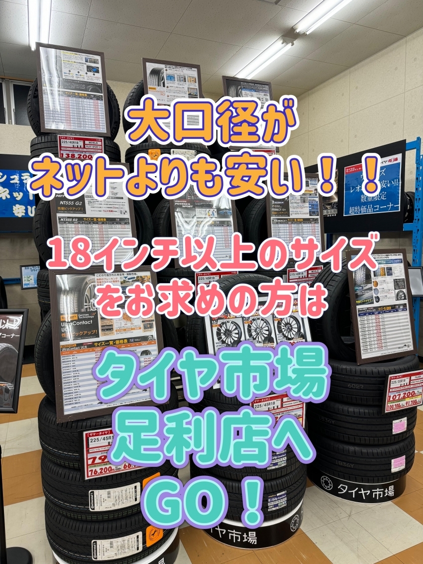 今18インチ以上の大口径タイヤを買うならタイヤ市場足利店が断然お得!!ネットショップよりも安い金額でご提供可能!タイヤ専門店ならではの高い技術力にも自信あり!!足利・太田・桐生・邑楽エリアにお住いの方、その他の地域にお住いの方も是非!