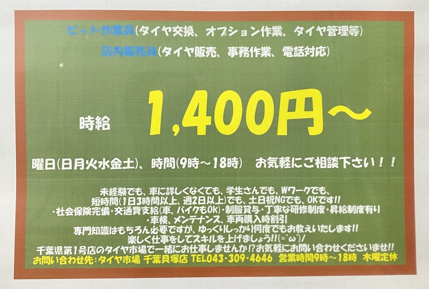タイヤ市場千葉貝塚店で一緒に働きませんか!?(=゚ω゚)ノ