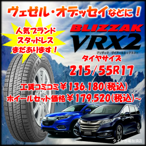 人気ブランドスタッドレスまだあります!ヴェゼル・オデッセイなどに!【ブリヂストンVRX2】サイズ215/55R17