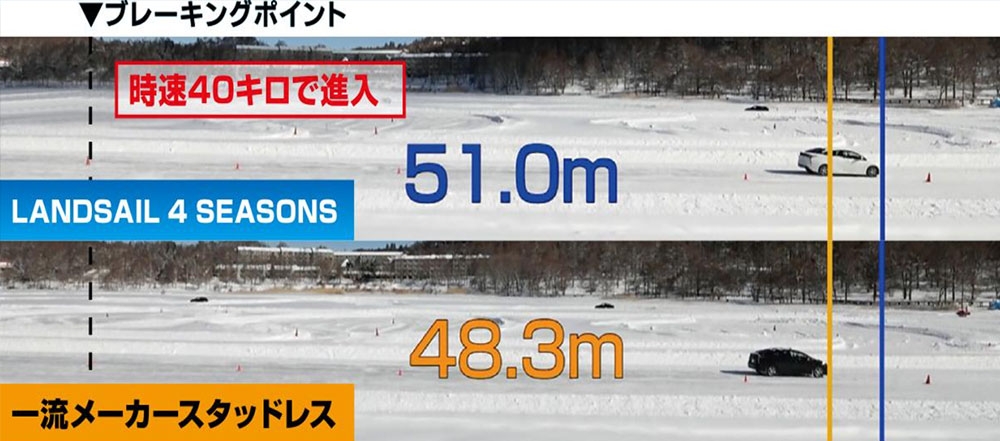 女神湖での試乗会では圧雪・氷上路面のブレーキ性能は一部のスタッドレスと同等レベルの制動性とコントロール性でオールシーズンタイヤの中でもトップクラスの結果でした。