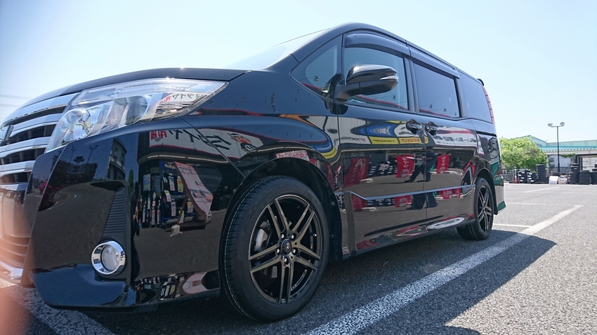 ノアにタイヤ市場オリジナルホイールZ-meistの新色!ブラッククリアを装着!(^^)!ボデイ色とマッチしていて非常に格好良く仕上がりました!!ツインの5本スポークがシンプルかつ迫力を出していますね!