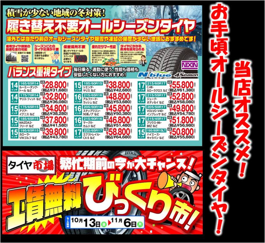 そんなオールシーズンタイヤを只今タイヤ市場ではチラシセール特別価格で販売中です!