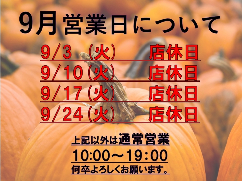 《9月営業日のご案内》何卒よろしくお願い申し上げます。