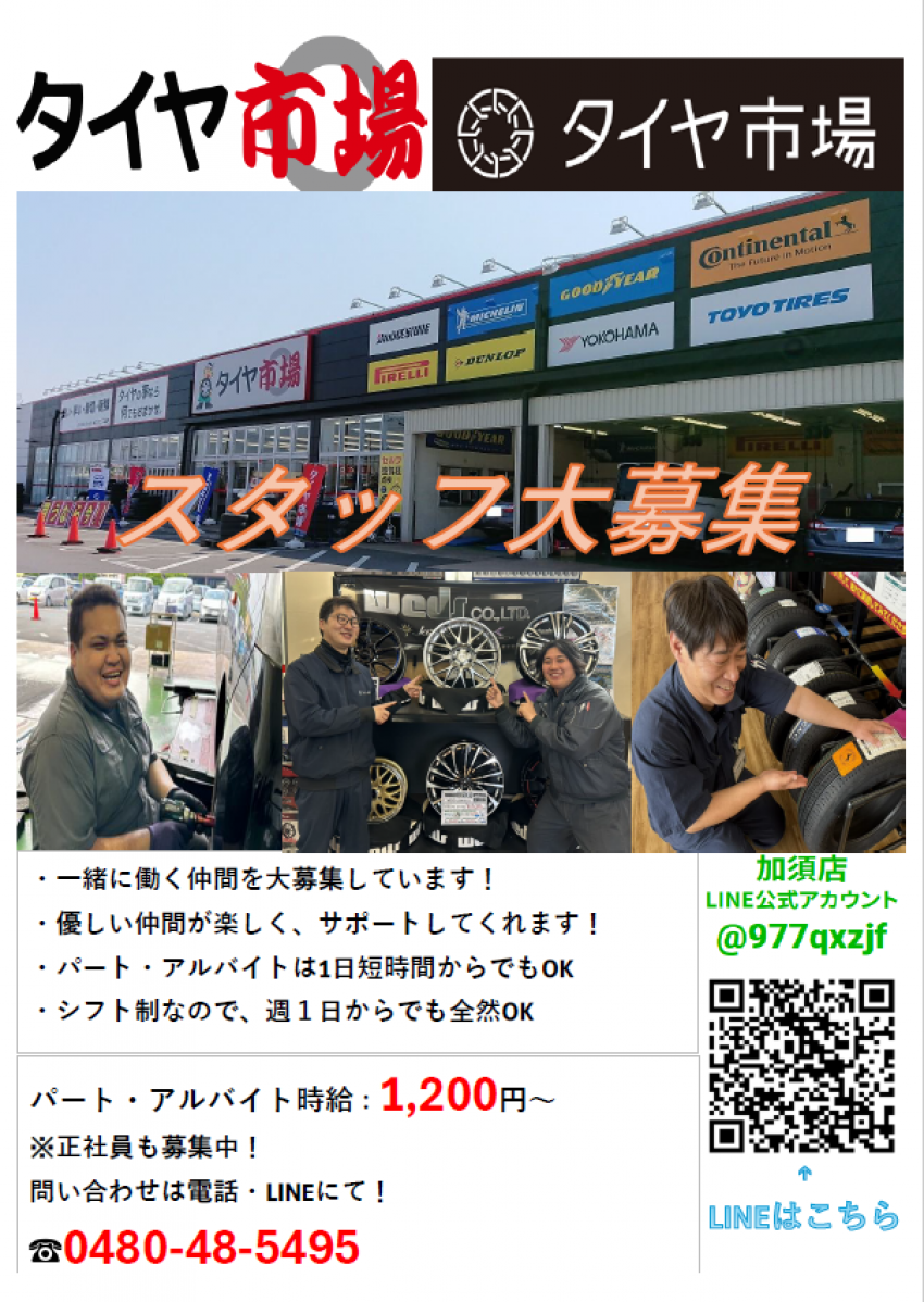 只今、タイヤ市場加須店では一緒に働いてくれるスタッフを大、大募集中です!!!