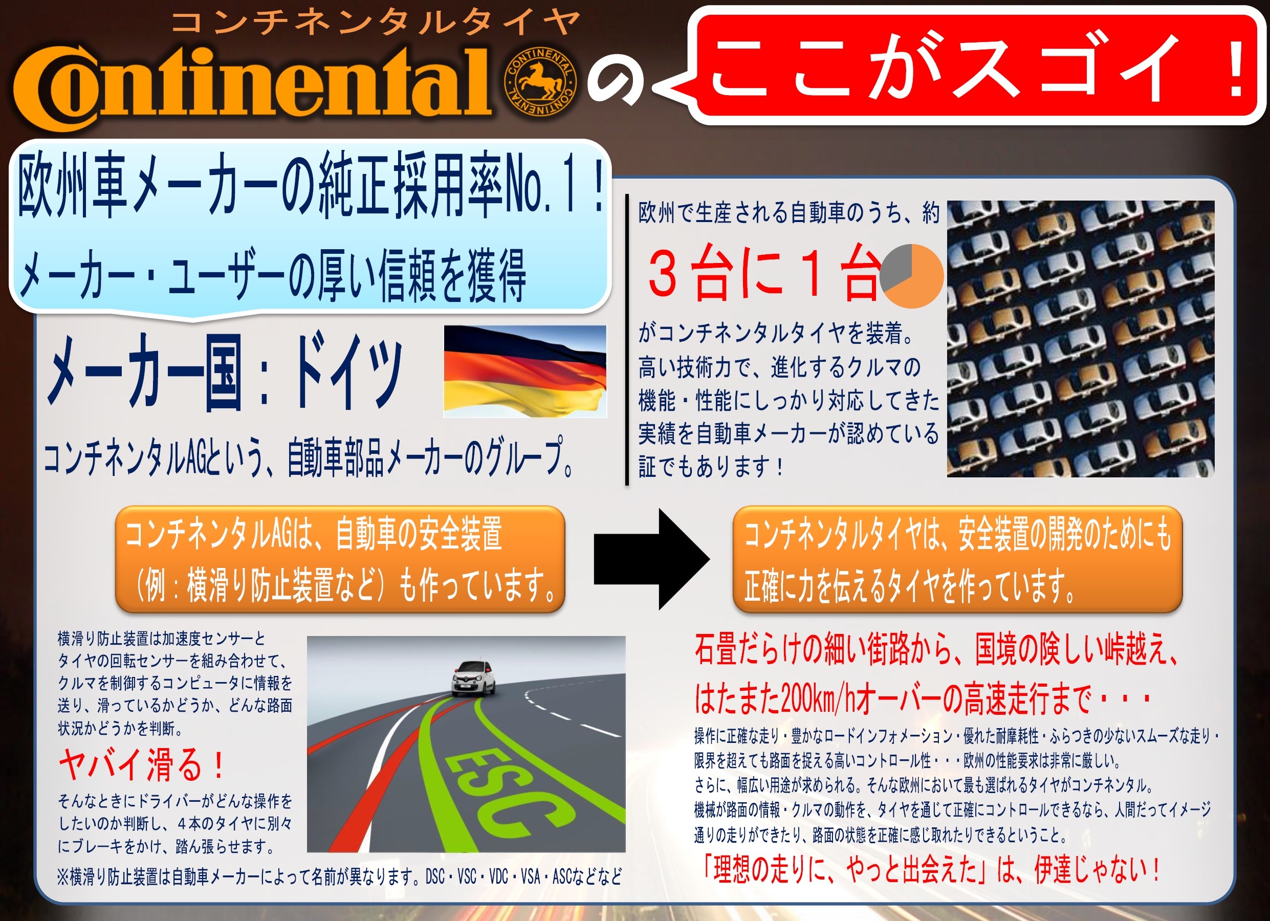 コンチネンタルタイヤは、ドイツのメーカーで、メルセデス・ベンツ、アウディ、BMW、フォルクスワーゲンなど、