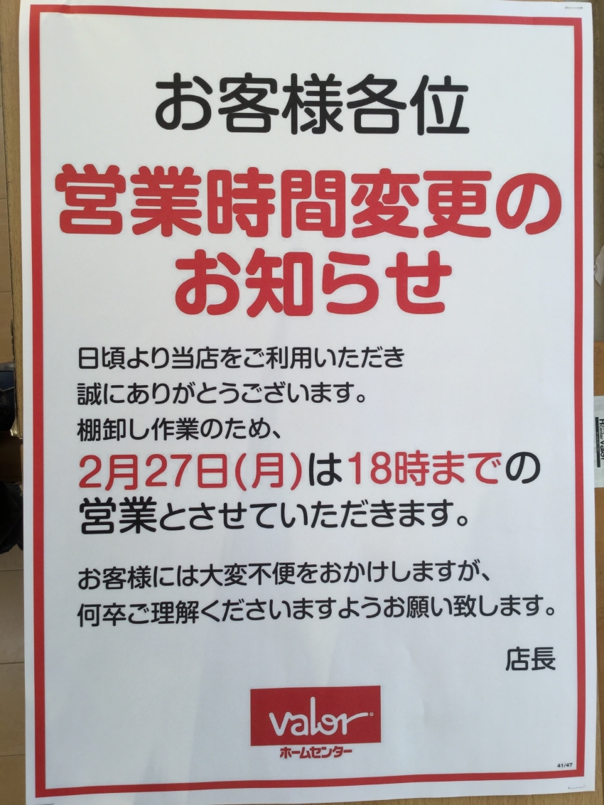 棚卸に伴う営業時間の変更のご案内を致します。
