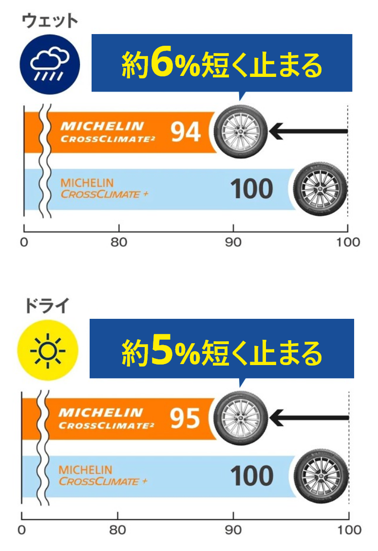 従来品よりもウェットグリップが6%、ドライグリップは5%向上。ウェット路面・ドライ路面でも高い夏タイヤ性能を発揮できます。