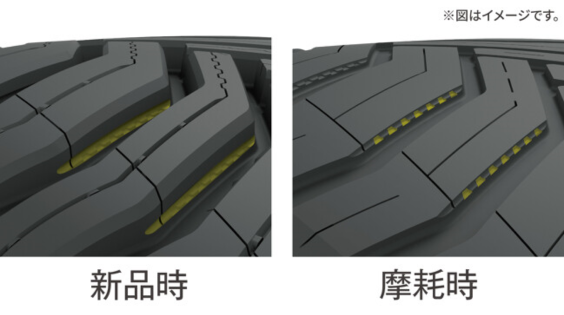 摩耗するにしたがって、ブロック側面に凹凸と溝が出現します。この溝が効率的に排水、排雪し、エッジ効果により摩耗時におけるウェット・雪上性能が向上。夏、冬ともに高い初期性能が長く続くから履き替え時まで安心です。