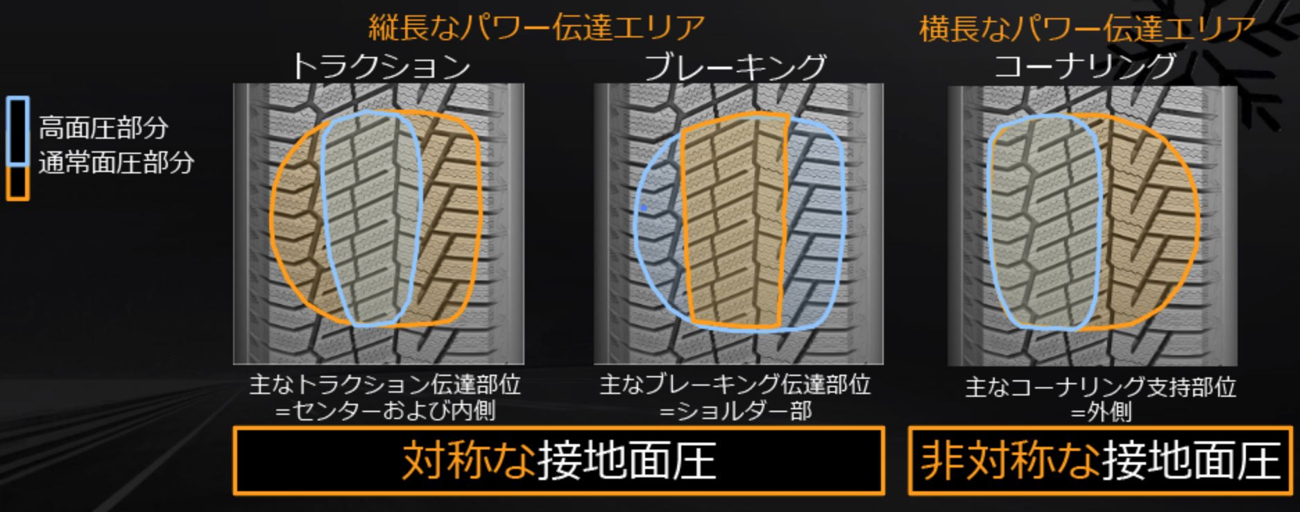 氷雪路路面でのパフォーマンスと、氷雪路以外でのパフォーマンスをわかりやすくまとめました。
