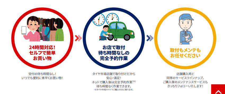 タイヤ市場では、《商品自体はタイヤ市場のWebサイトで購入頂き(しかも24時間対応)、作業日の予約を取り、店舗で作業を行う》というサービスが御座います!(^^)!