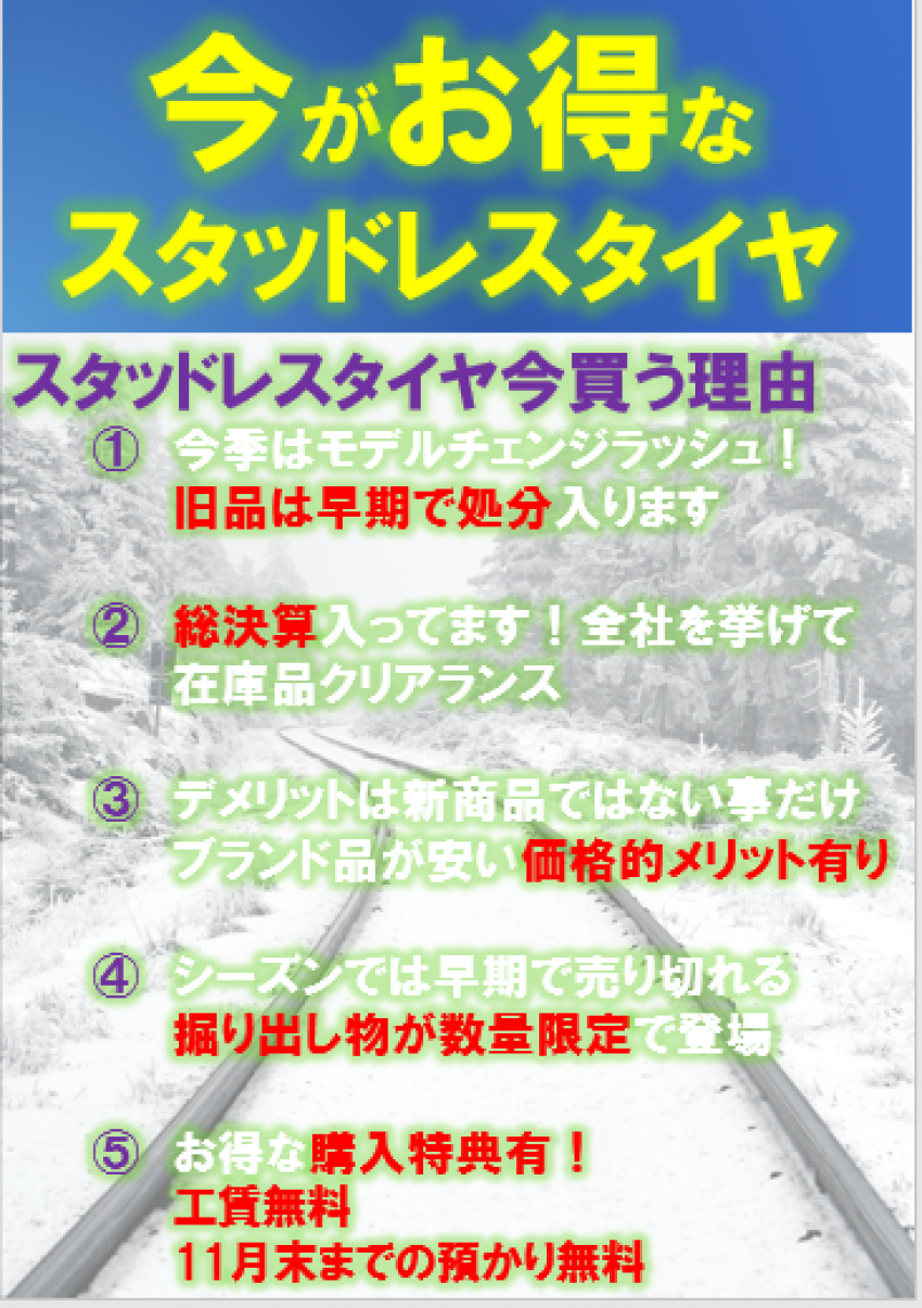 今回は、上記の二種類をご紹介致しましたが、ミシュランやグッドイヤーそしてピレリ等の他の一流メーカーの旧年製スタッドレスも御座いますので、今年スタッドレスのご購入をお考えのお客様、是非とも一度当店に足を運んでみて下さい!!