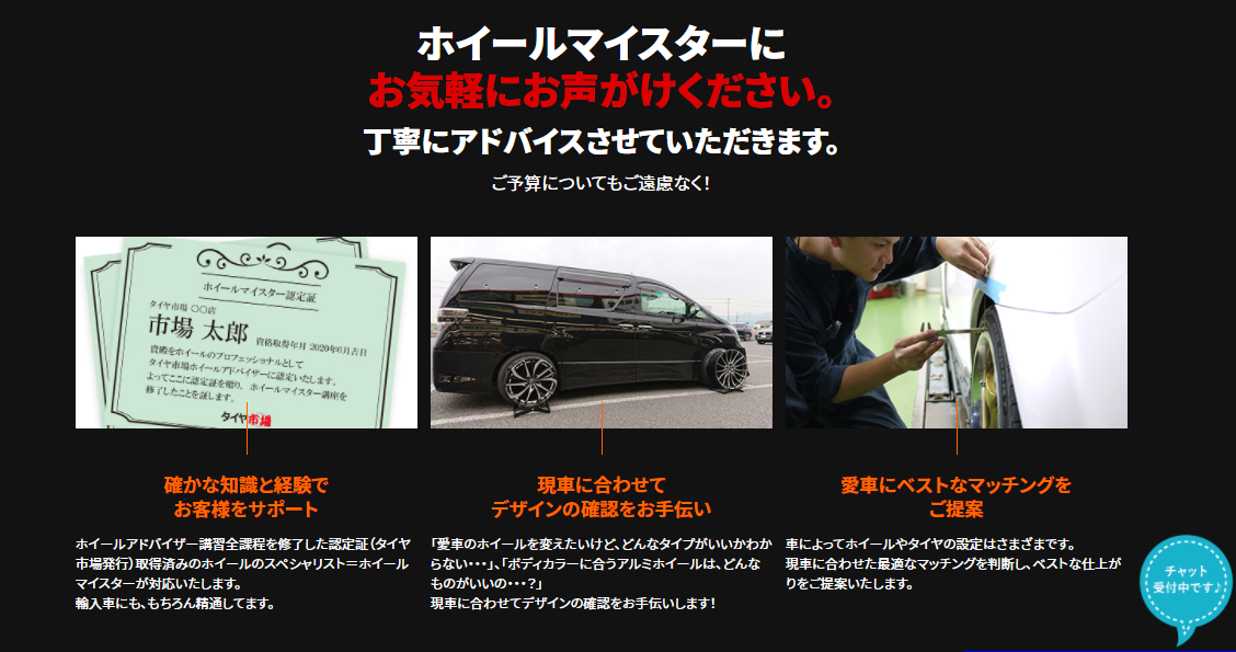 そして、タイヤ市場には各店毎にアルミホイールに精通したホイールマイスターが在籍しておりますので、アルミホイールに関するご相談はタイヤ市場にお任せ下さい!(^^)!