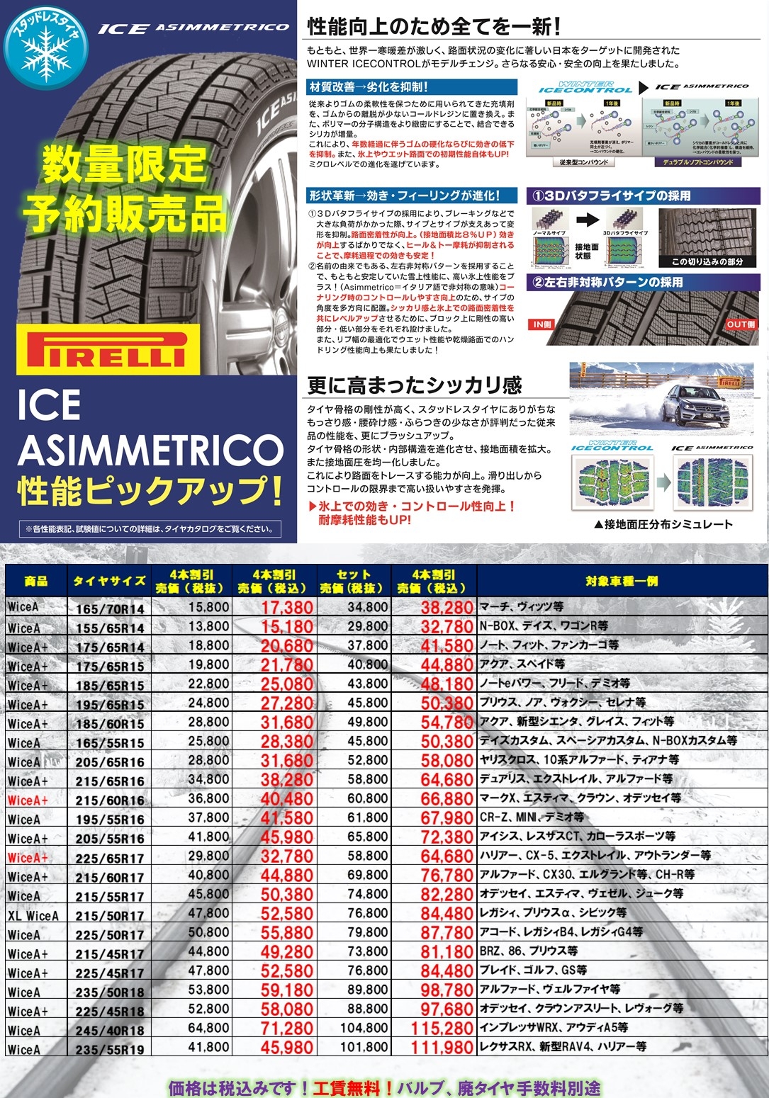 ※廃タイヤ処分料・ゴムバルブ代・パンク保証込みの価格となっております。