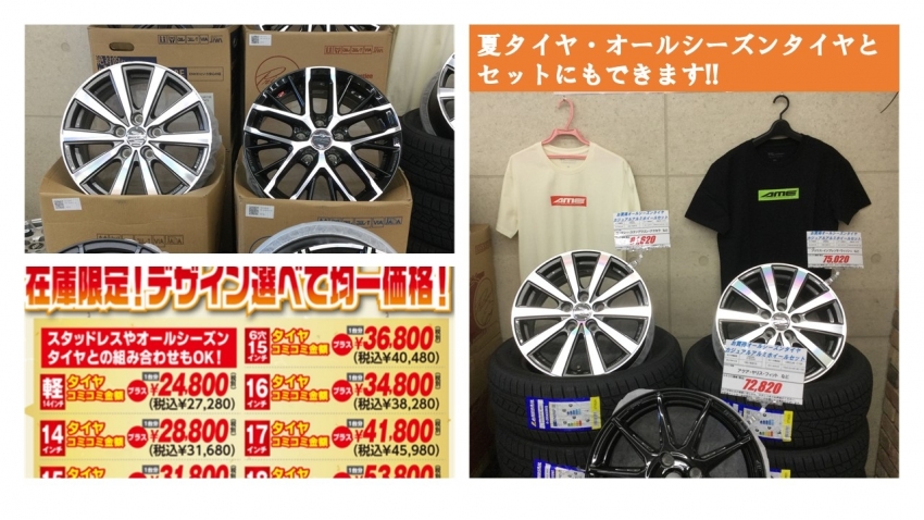 今の時期ですとスタッドレスタイヤとのセットやオールシーズンタイヤ、夏タイヤのセットでお取付してみませんか?