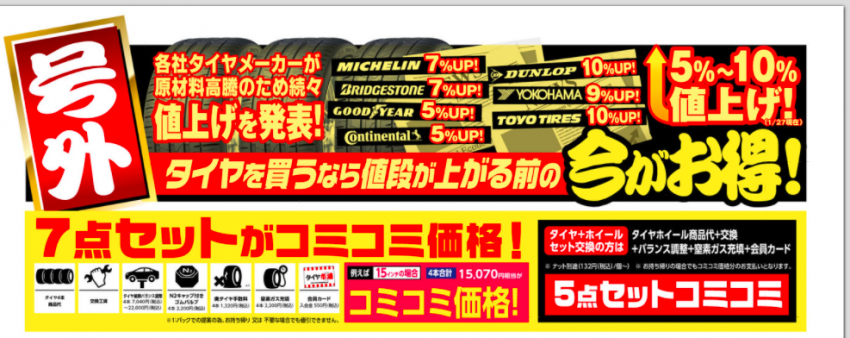 原油価格の高騰により、各タイヤメーカー値上げが