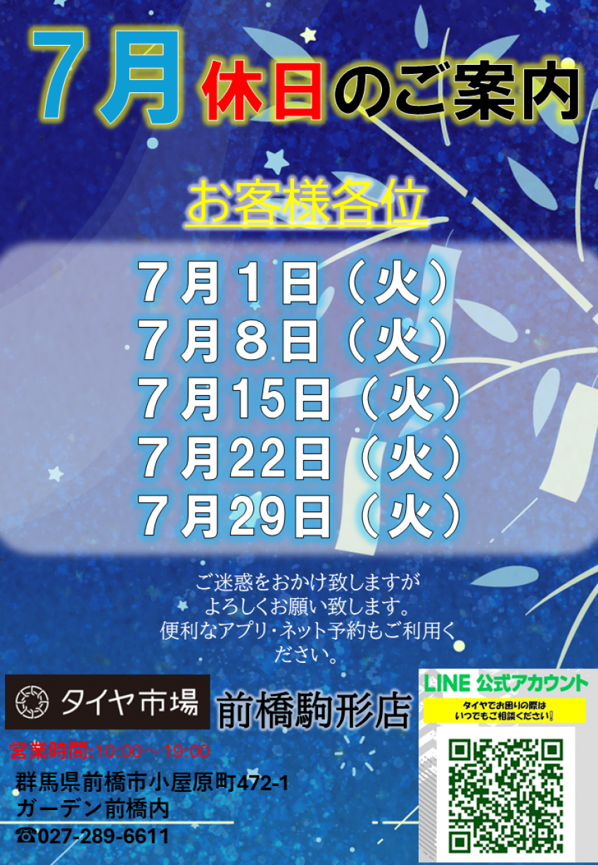 7月8日火曜日は店休日です!