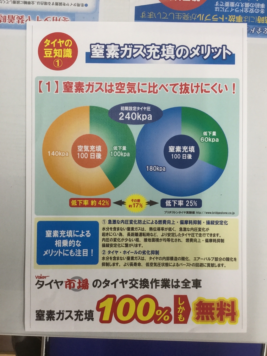 さて、窒素ガスとは?といったお客様に向けて、少しご説明させていただきます!タイヤ市場では、タイヤに、空気の代わりに窒素を入れさせていただいてます。窒素ガスは普通の空気と比べ、分子が大きいため、ゴムからが抜けづらく、空気圧が長い間安定します。さらに、窒素ガスには水分が含まれないことから、タイヤの劣化の抑制にもつながります!その他様々なメリットがあり、タイヤにやさしいガスと言えます!