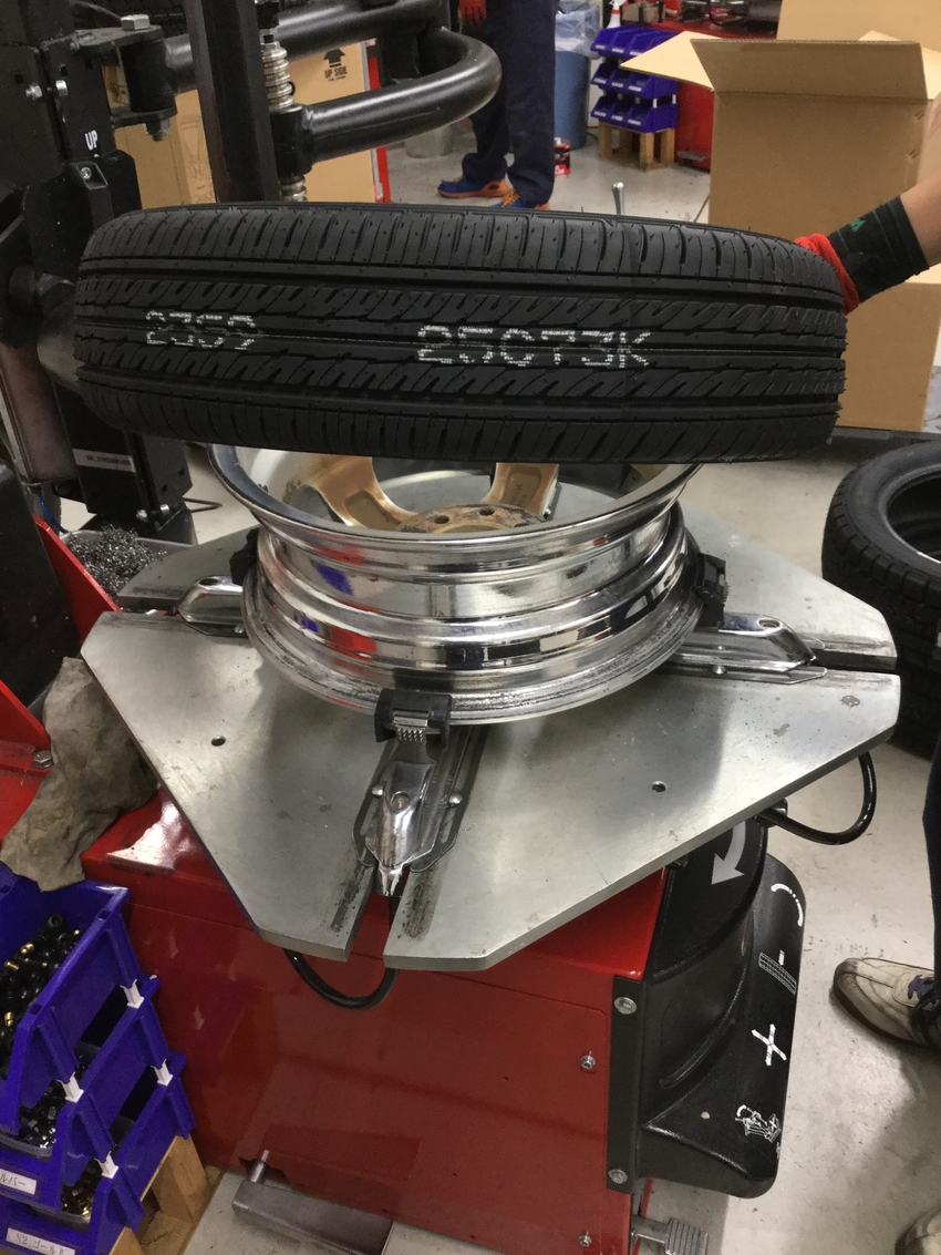 通常、ディスク面(正面のお皿の部分)を上にして、タイヤを組むのですが、リバースホイールはホイールを逆さまにして、逆側からタイヤを組みつけるようになっています。自分もタイヤ市場で働くようになってから、1年になりますが、今回初めてリバースホイールの組み付けをさせていただきました。