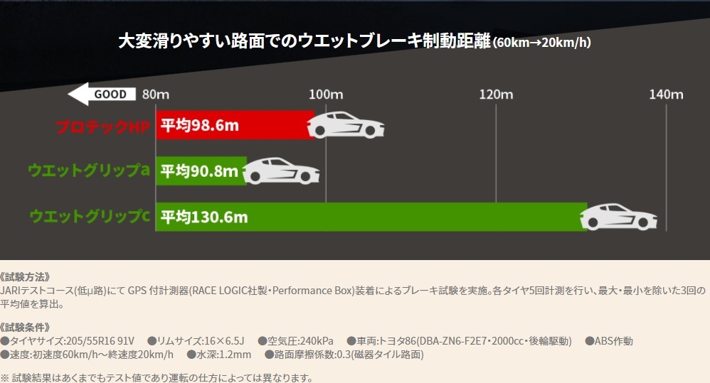 この差でウエット性能の重要性がわかっていただけたかと思います。