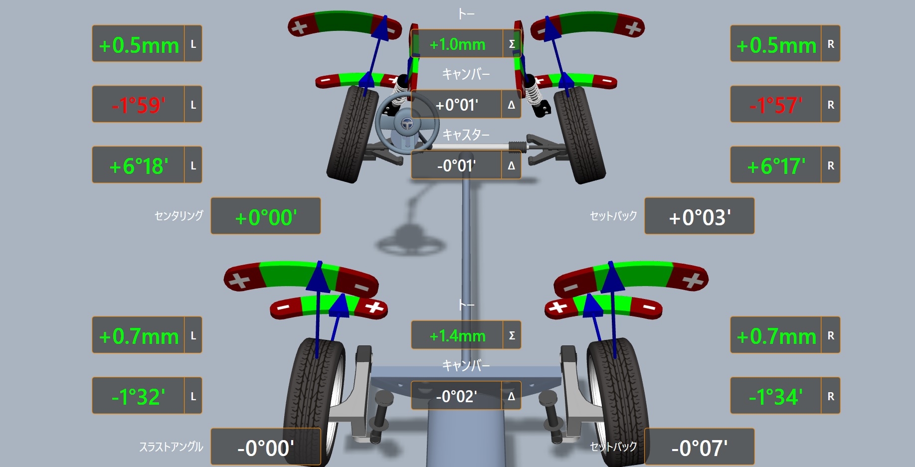 純正全項目調整可能な車種で左右計10カ所を調整していきます。