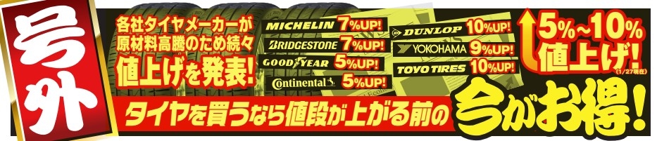 先日、タイヤが各メーカー値上がりのお話をしたと思いますが、