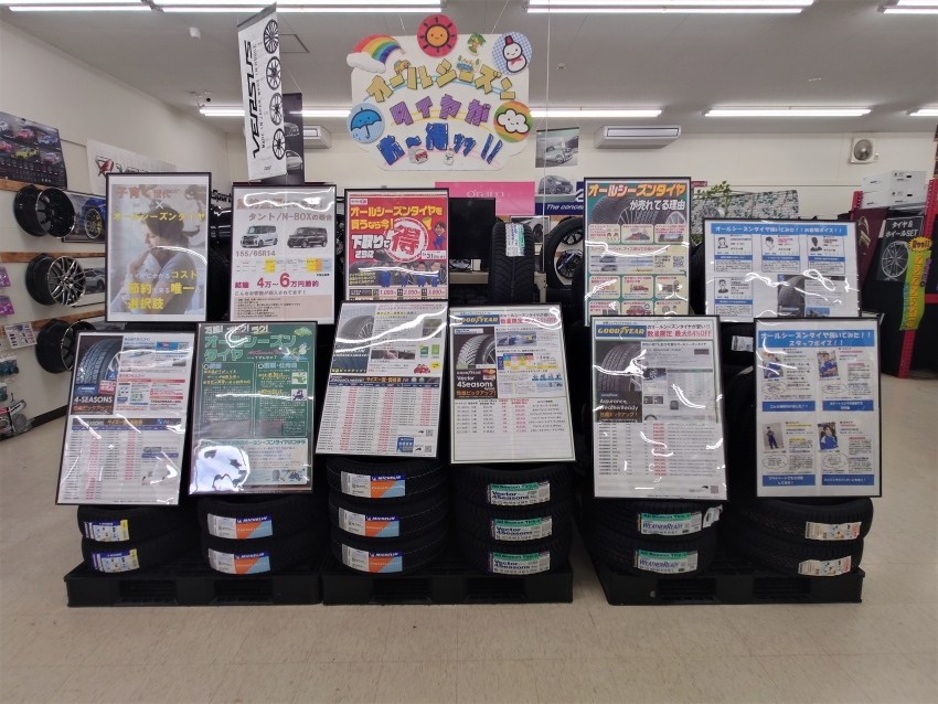 当店人気のオールシーズンタイヤは店内で見られるよう各メーカー置いてあります!