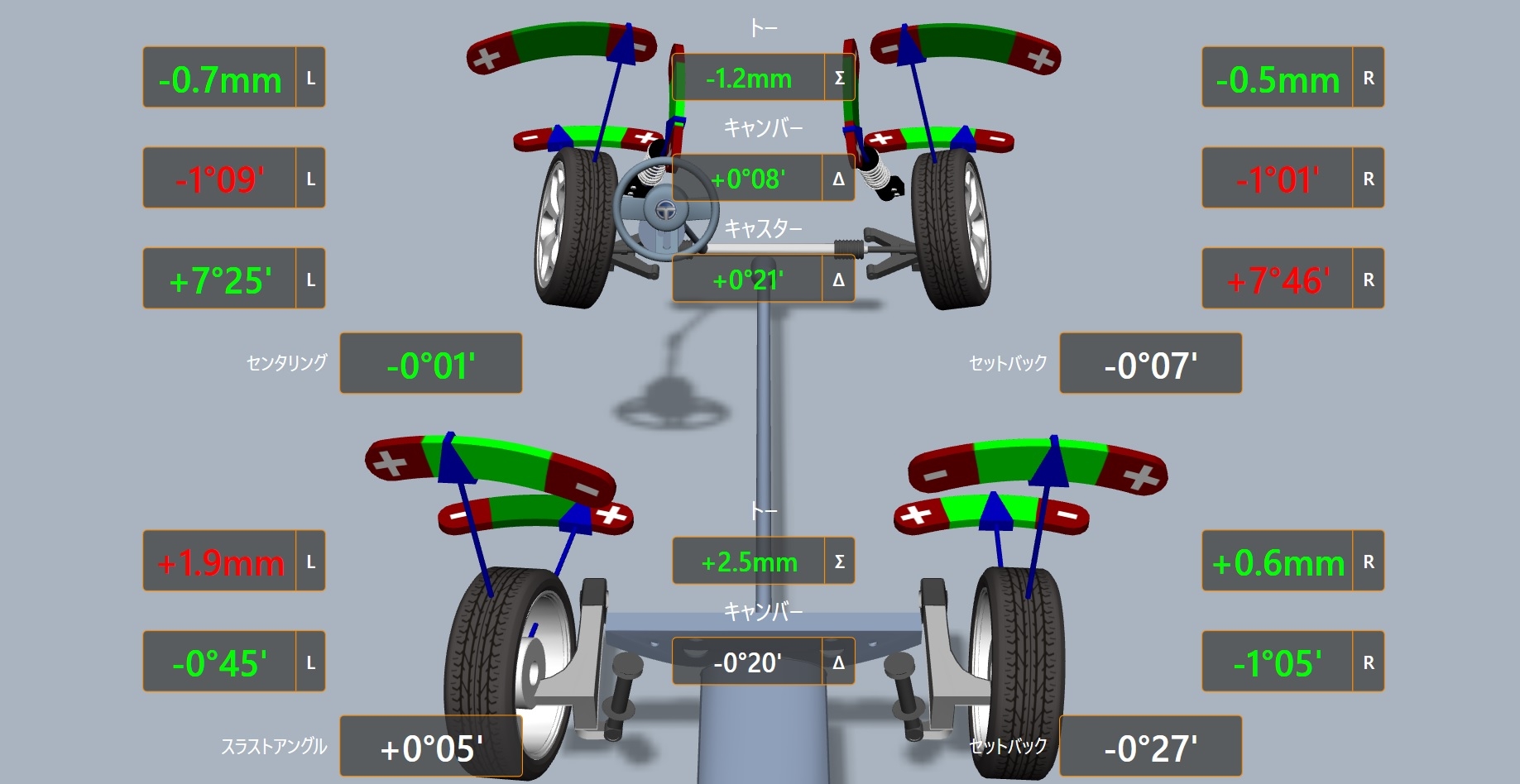 左リアのトー以外は大きなズレはありませんがハンドルセンターズレがありました。
