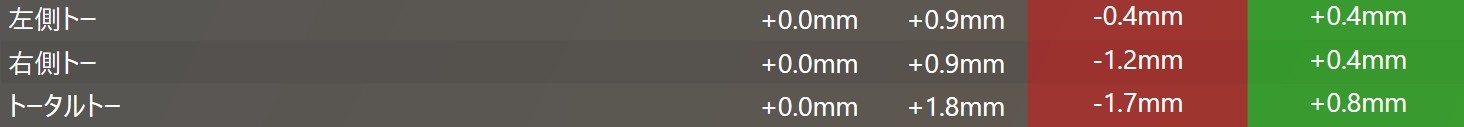 こちらをトーイン方向(左右+0.4ミリ)に調整させていただきました。
