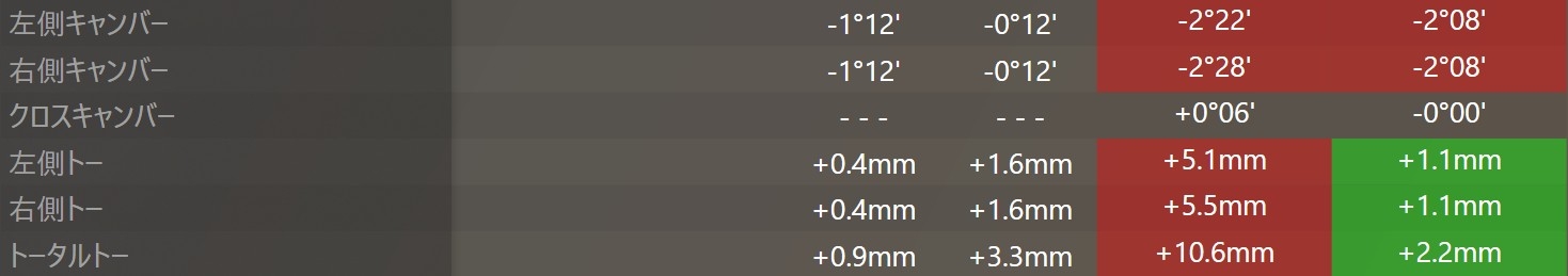 数値のズレとしては車高を下げたためトーがトーイン方向にキャンバーはハの字方向に寝ていました。