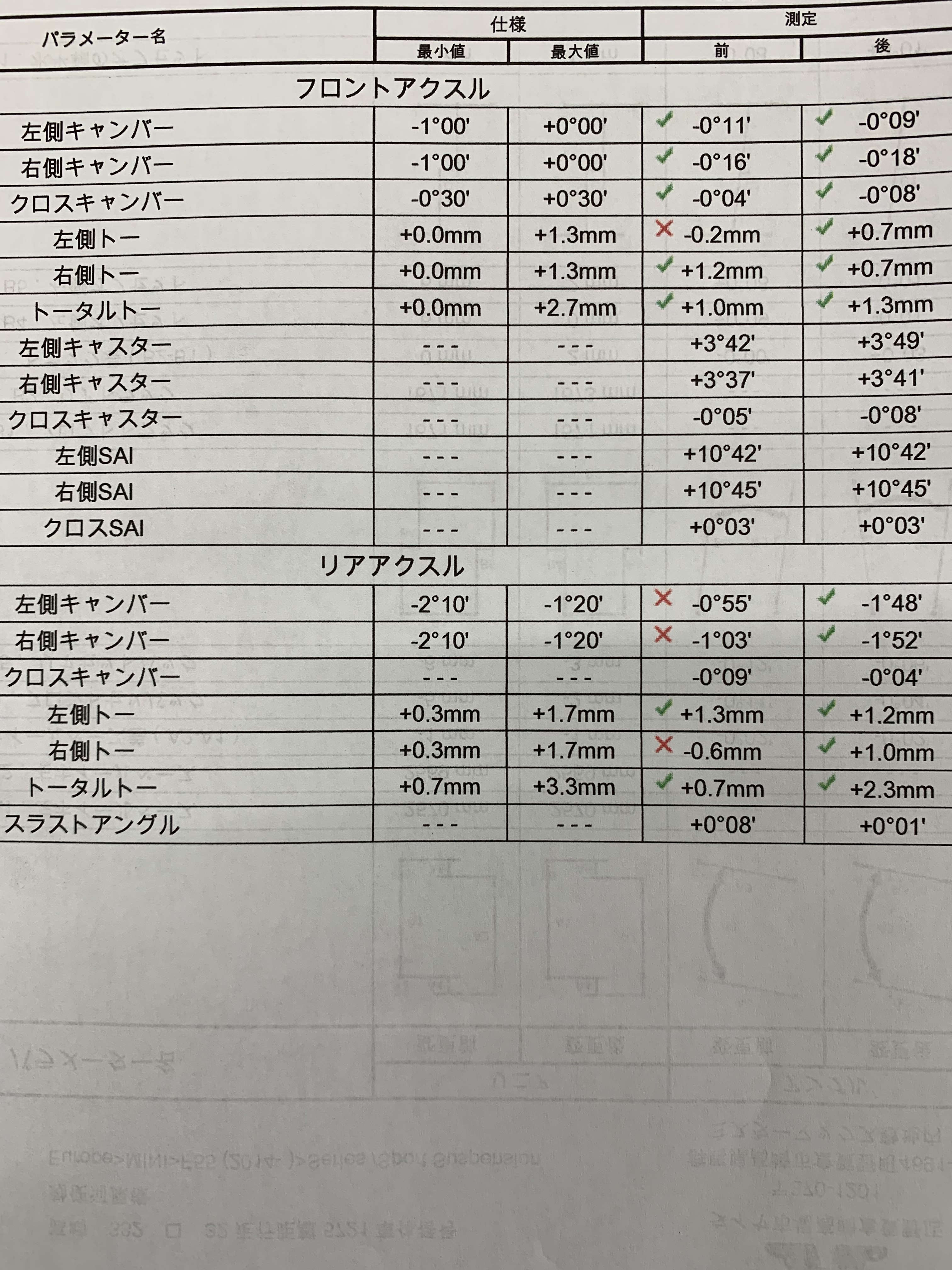 フロントのトー、リアのトーにキャンバーとかなりずれておりました。