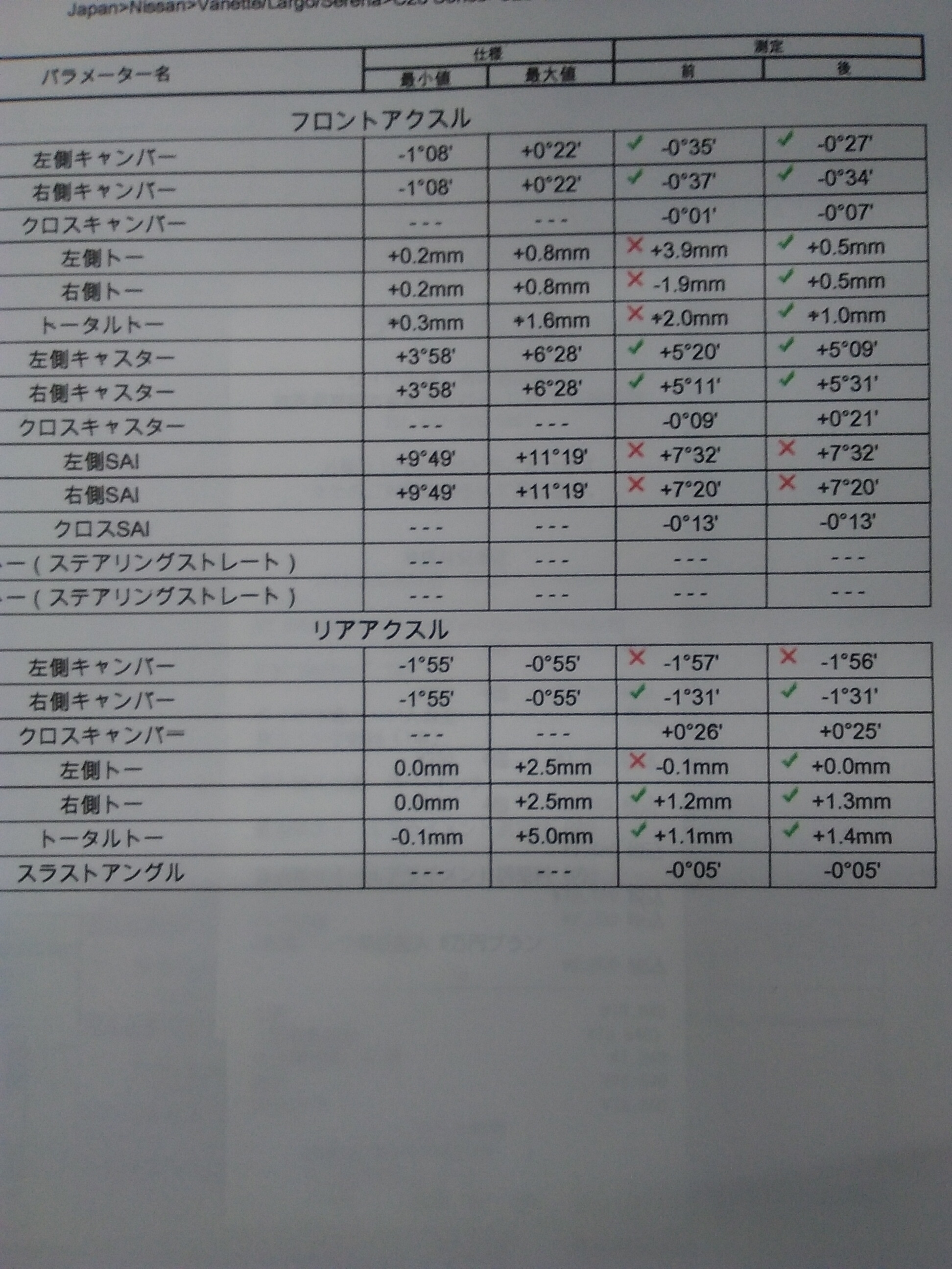 先日、セレナのアライメント調整したので