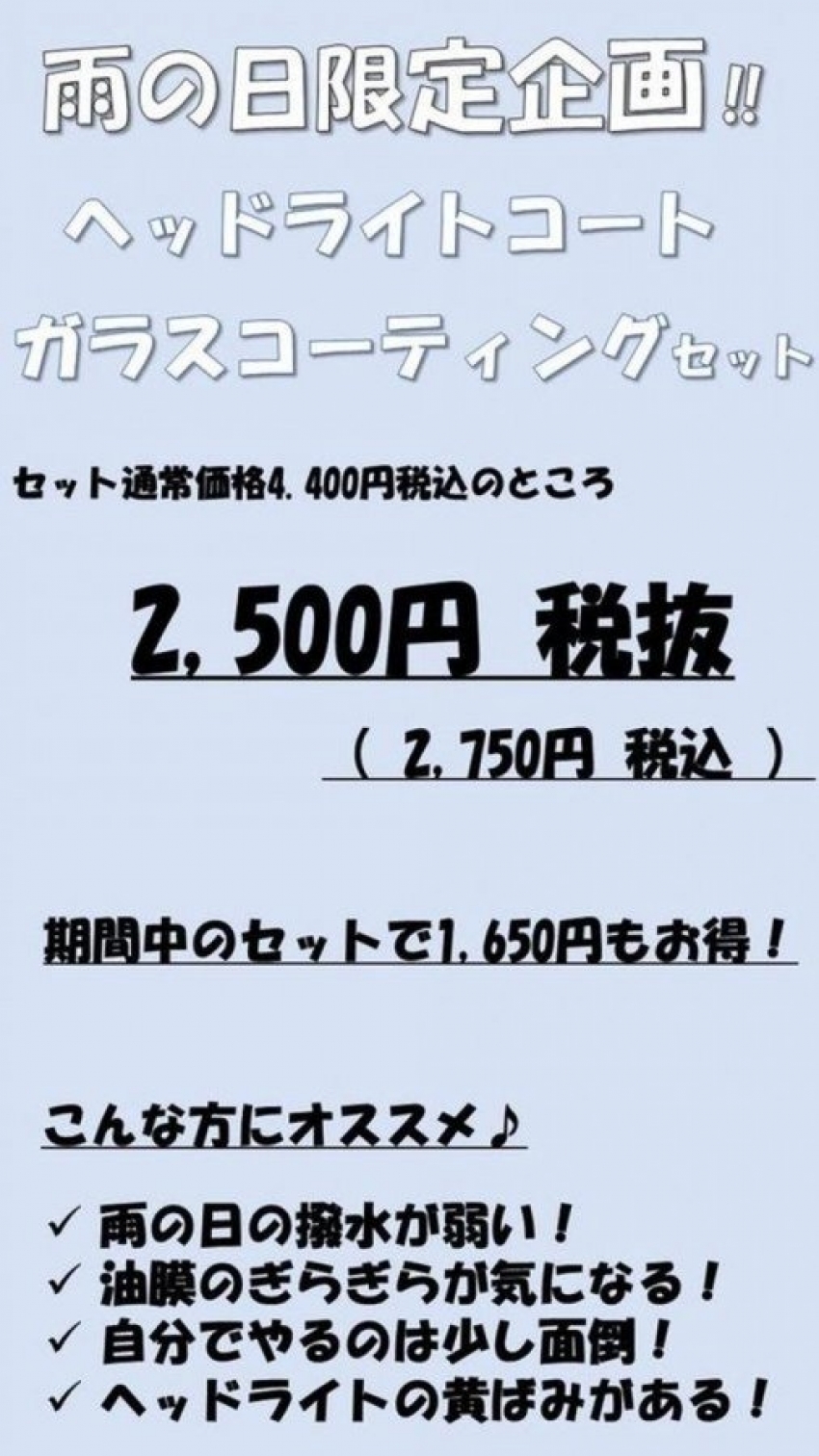 雨の日限定企画!!ヘッドライト&ガラスコーティングセット!