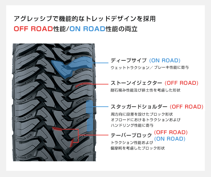 タイヤは対噛石性能、排土性を考慮したトレッドデザインを採用しています!
