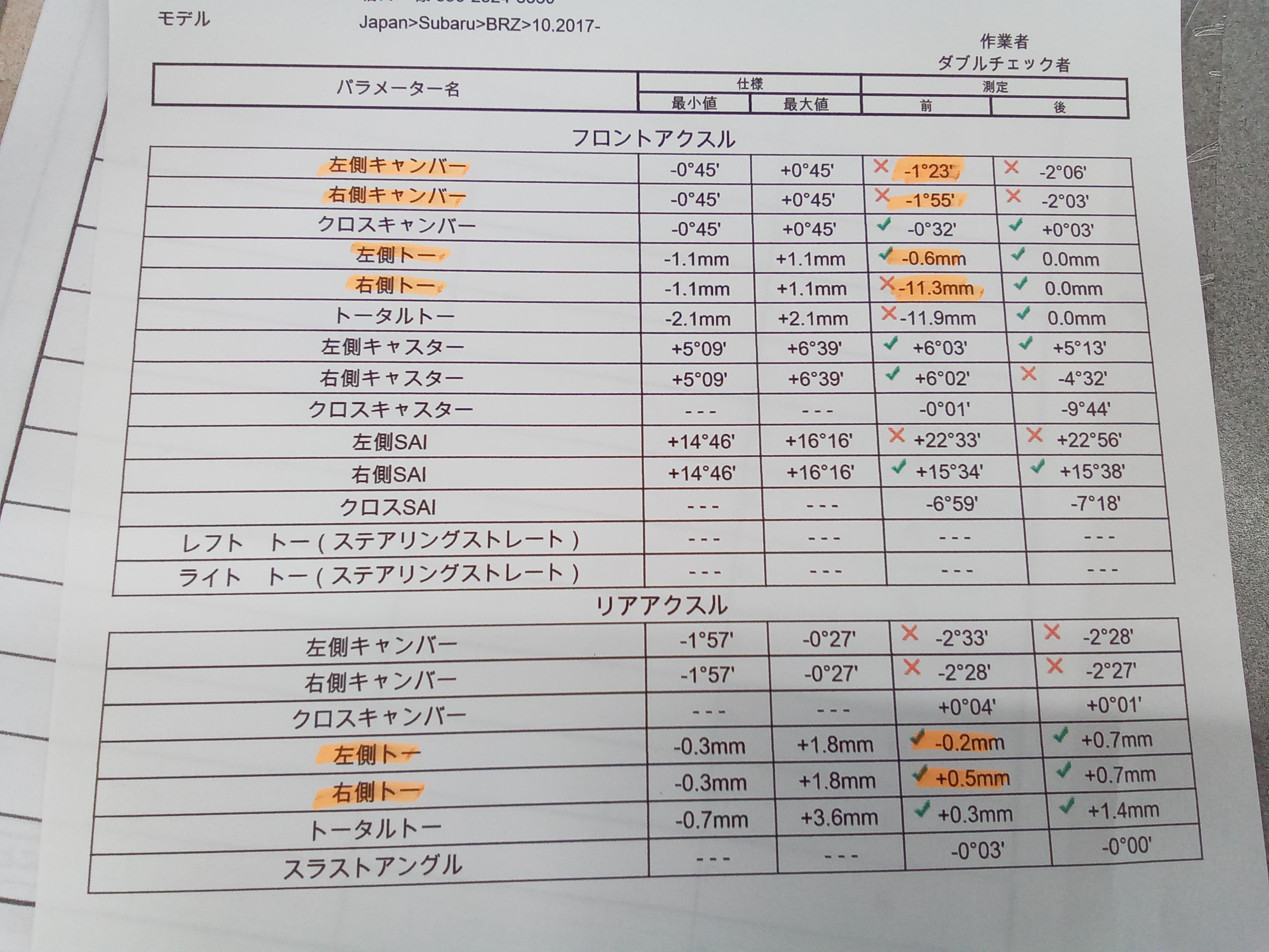 さきほど、スバルBRZのアライメント調整が完了したので
