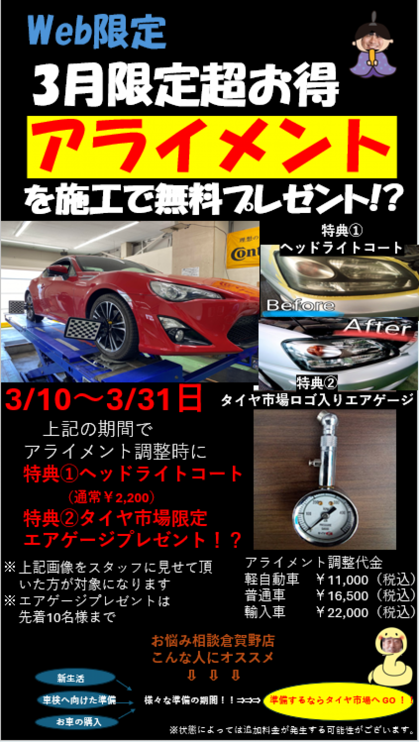 なんとアライメント調整の際にヘッドライトコート+タイヤ市場限定エアゲージを