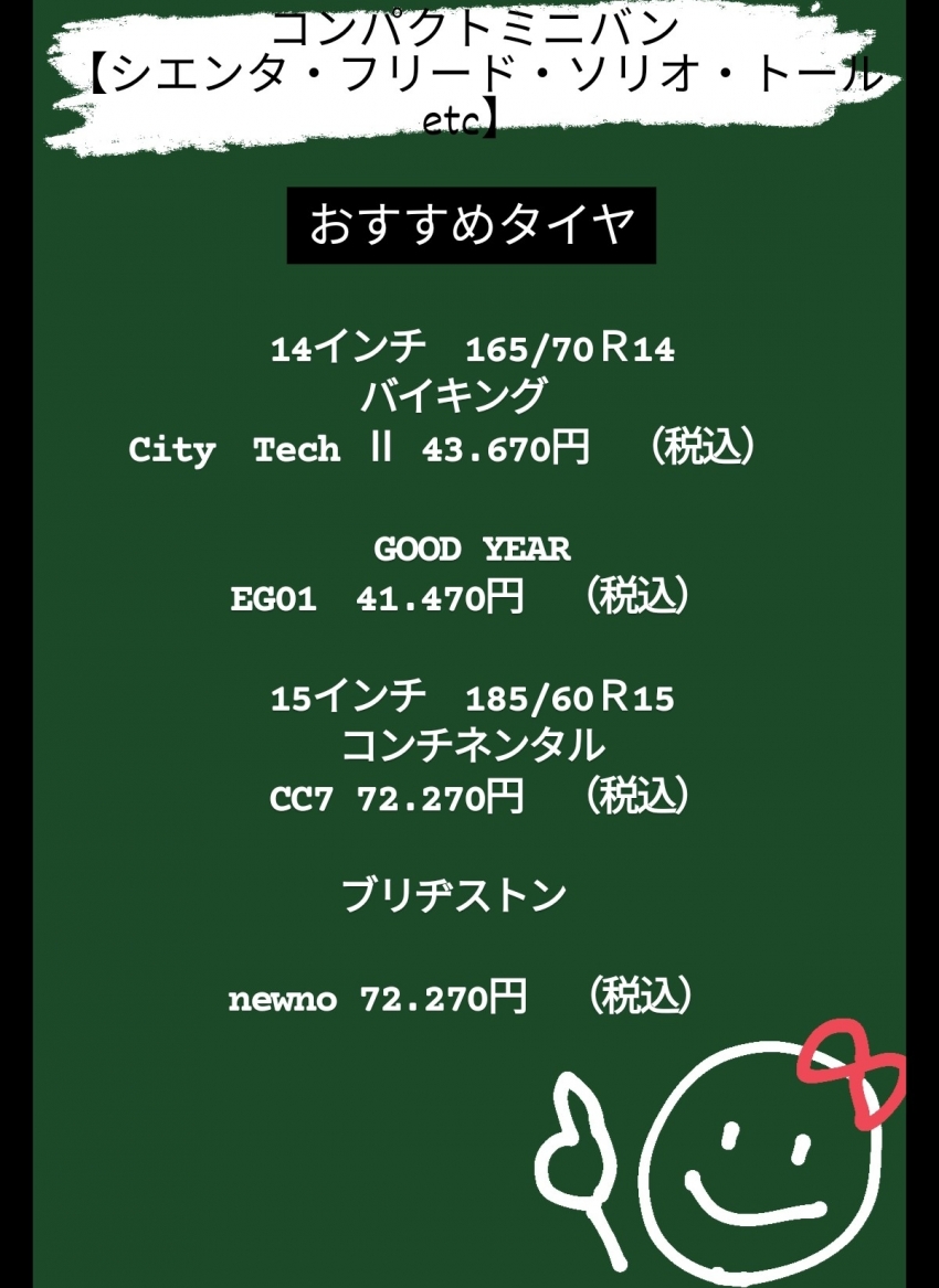 今回はソリオ、シエンタ、トールなどのコンパクトミニバンにオススメのタイヤです!