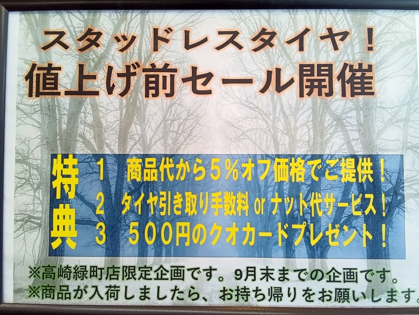 ただいまスタッドレスタイヤセール中です!高崎市周辺にお住みの方はタイヤ市場高崎緑町店にお越しください!