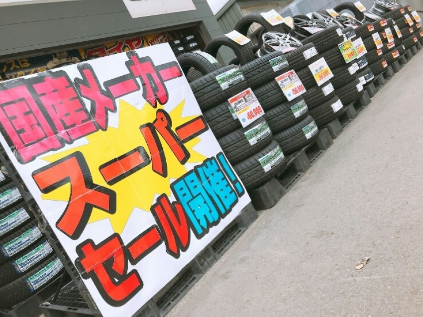 駐車場に向けて国産スーパーセールを展示しており、反対側には今、当店で売れ行きが高いメーカーを置いております。