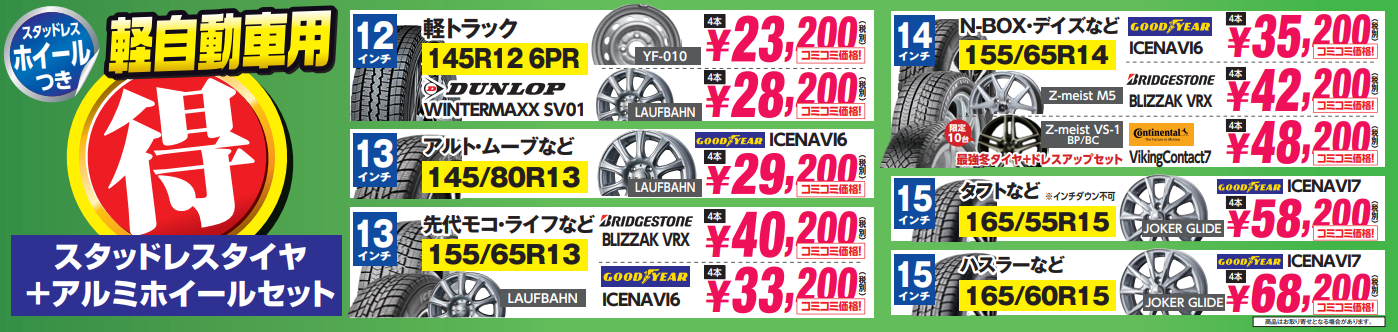 軽には有名国産メーカータイヤ+ホイールセット 思わず目が出るびっくり価格23,200円~