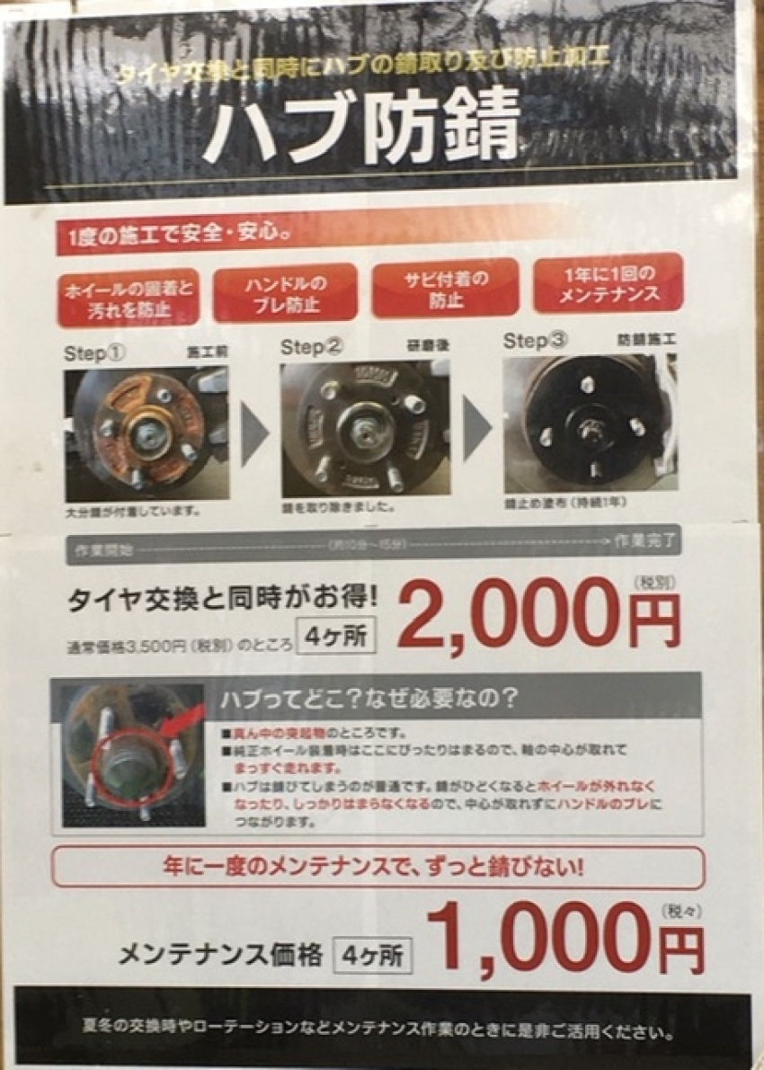 他にもエアコンガス、ハブ防錆、クレベリン等の作業も行っていますので
