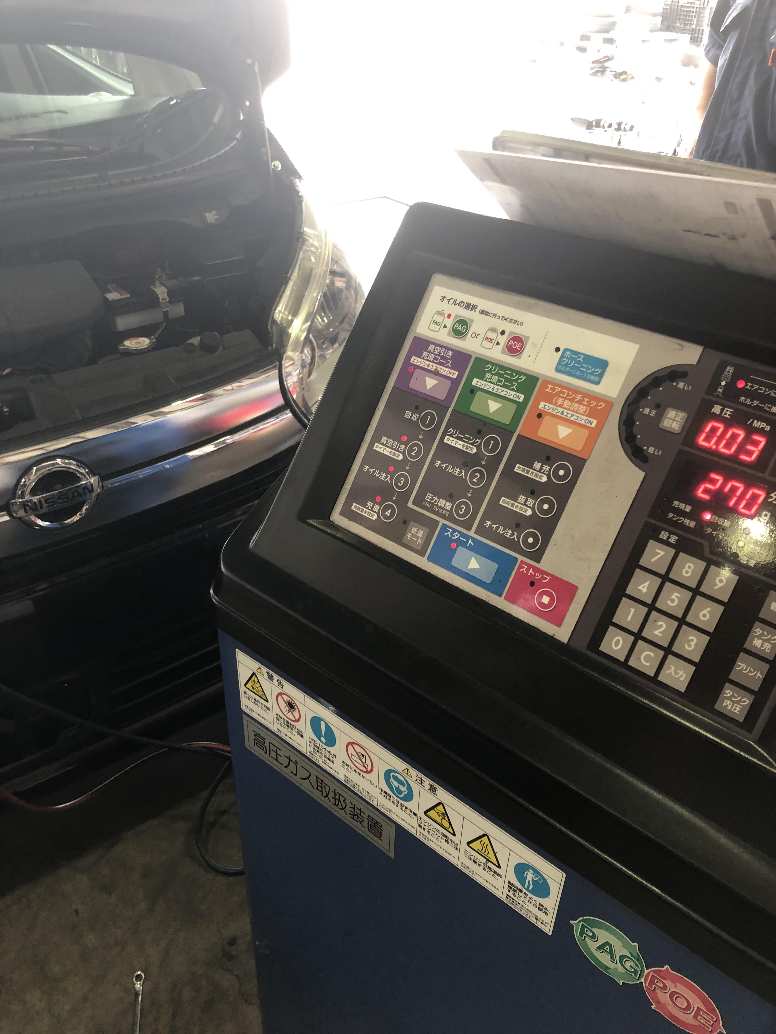 入庫時にエアコンの効きが気になったのでお客様に声掛けをしたところお車をぶつけた経験があるとのことでアライメント調整も提案させて頂きました!なので今回はエアコンガスクリーニング真空引きとアライメント調整をさせて頂きました!