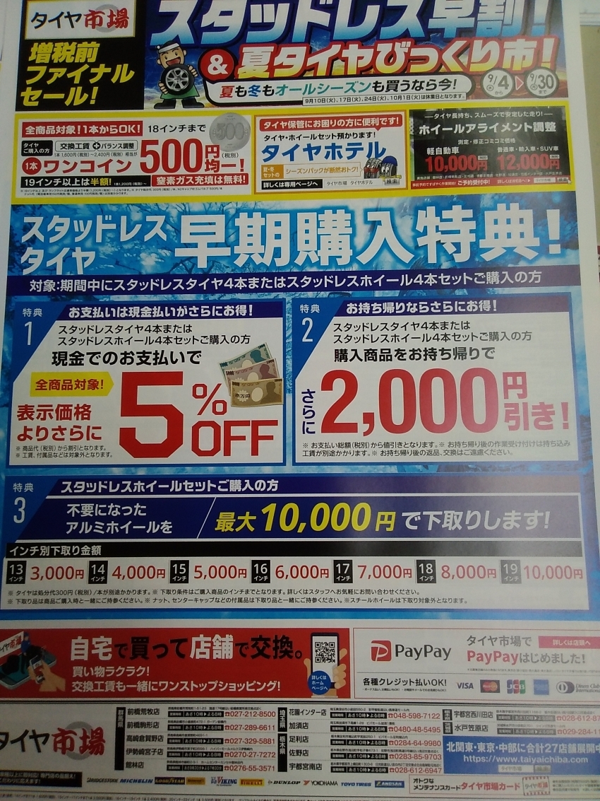 タイヤ市場創立10周年に伴い、大好評の現金5%引き&持ち帰り2,000円引きが復活しました。