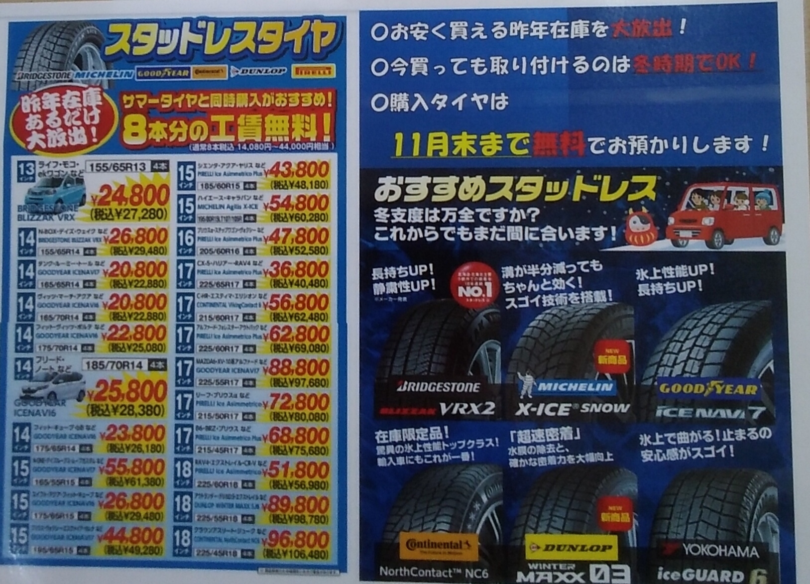 夏タイヤ&スタッドレス8本ご購入で、工賃無料!!!!