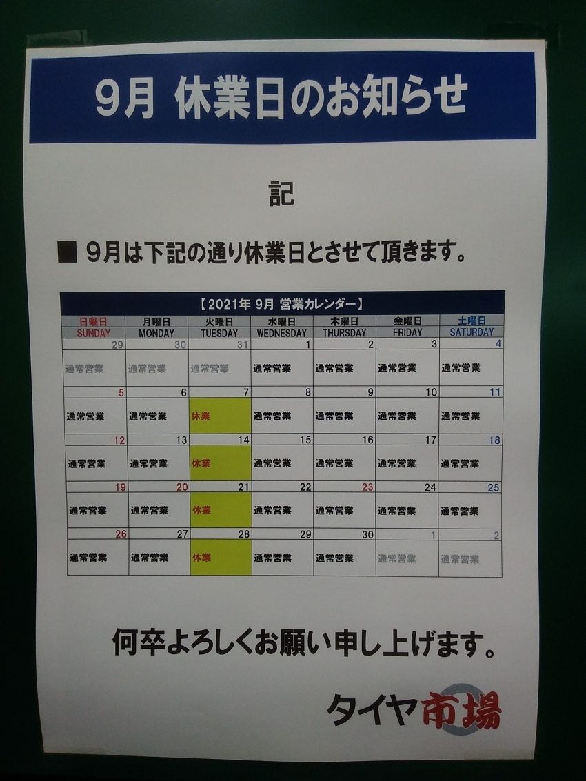 9月店休日のお知らせ!!