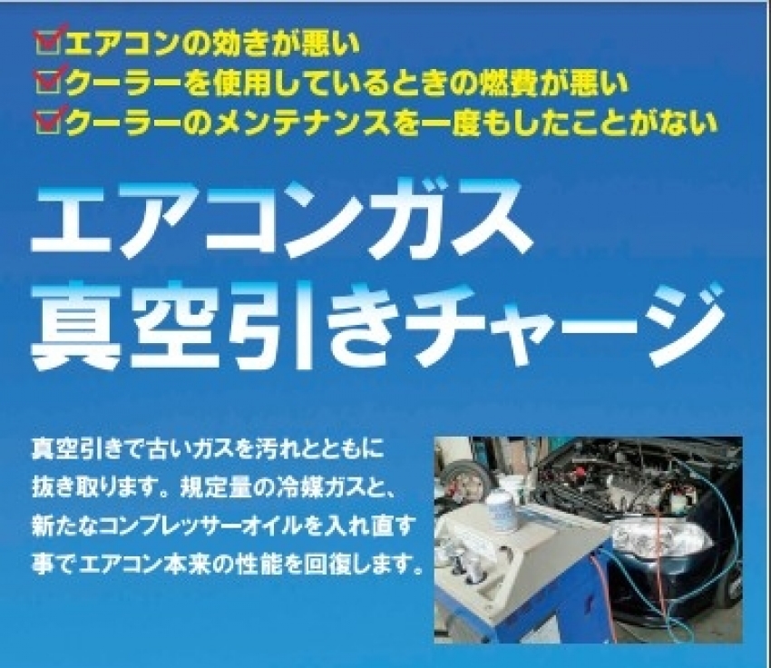 長年乗っていると、どうしてもお車のエアコンのガスが抜けてしまったり、配管に水分や汚れが溜まってしまい、冷えが悪くなってしまうもの......