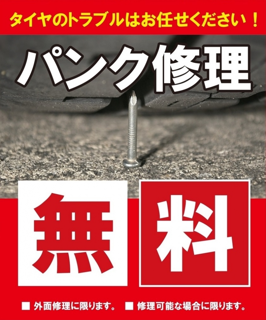 思わぬタイヤのパンクを無料で修理いたします!
