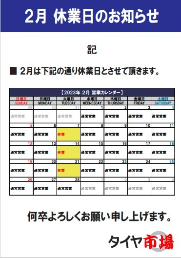 2月の店休日のお知らせです